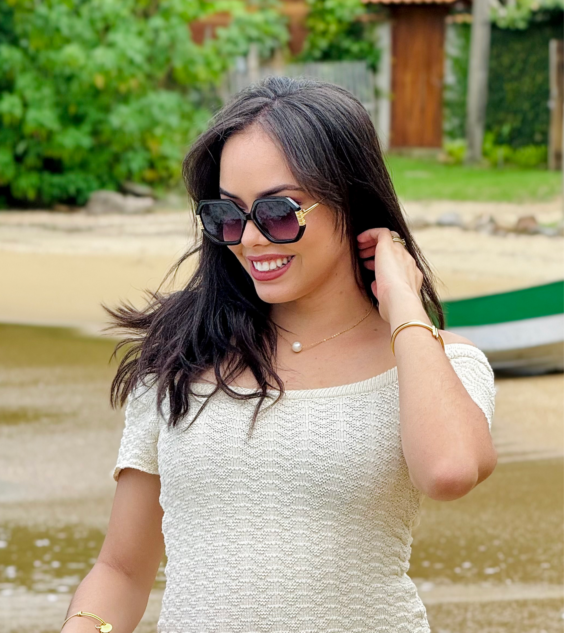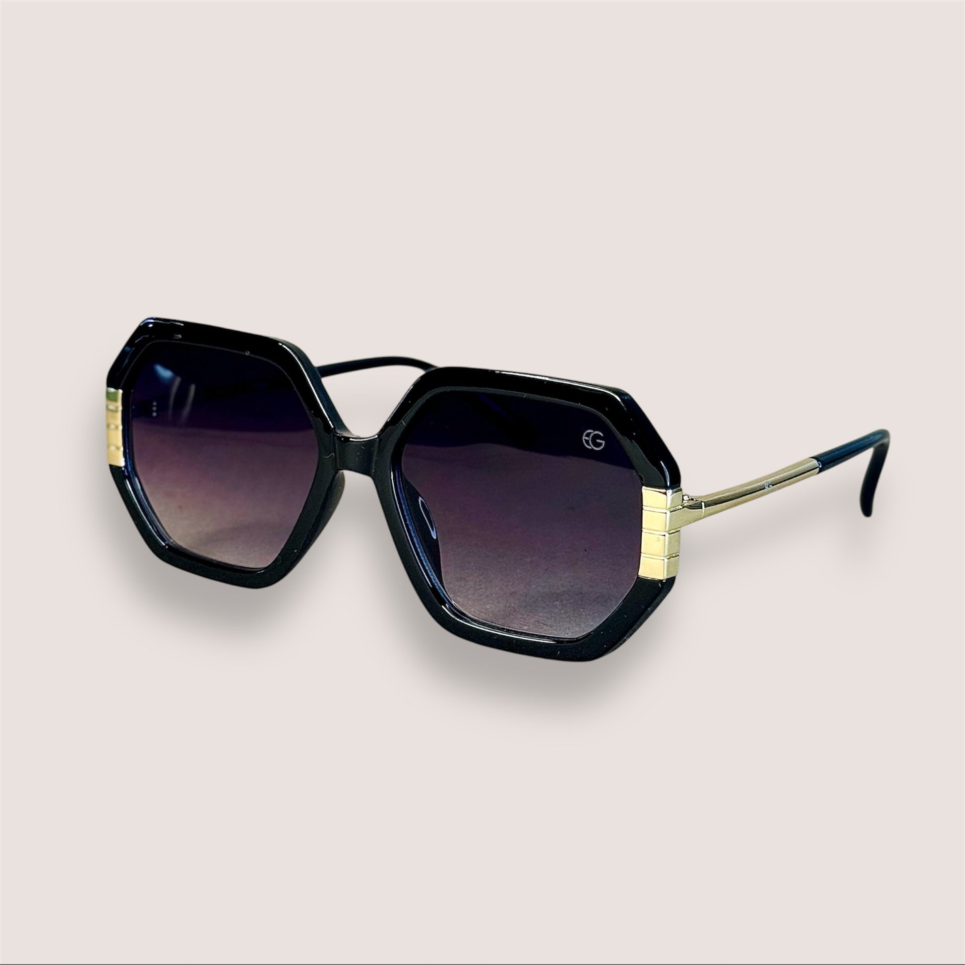 Com seu formato hexagonal distintivo, esse modelo oferece um ar de ousadia e originalidade. O contraste com as hastes em metal dourado adicionam um toque de glamour, as lentes em acetato garantem leveza e conforto ao usar, além de uma aparência luxuosa.
